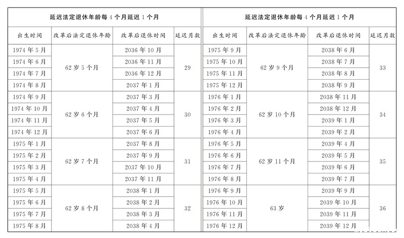 第一条 从2025年1月1日起,男职工和原法定退休年龄为五十五周岁的女职工,法定退休年龄每四个月延迟一个月,分别逐步延迟至六十三周岁和五十八周岁;原法定退休年龄为五十周岁的女职工,法定退休年龄每二个月延迟一个月,逐步延迟至五十五周岁。国家另有规定的,从其规定。